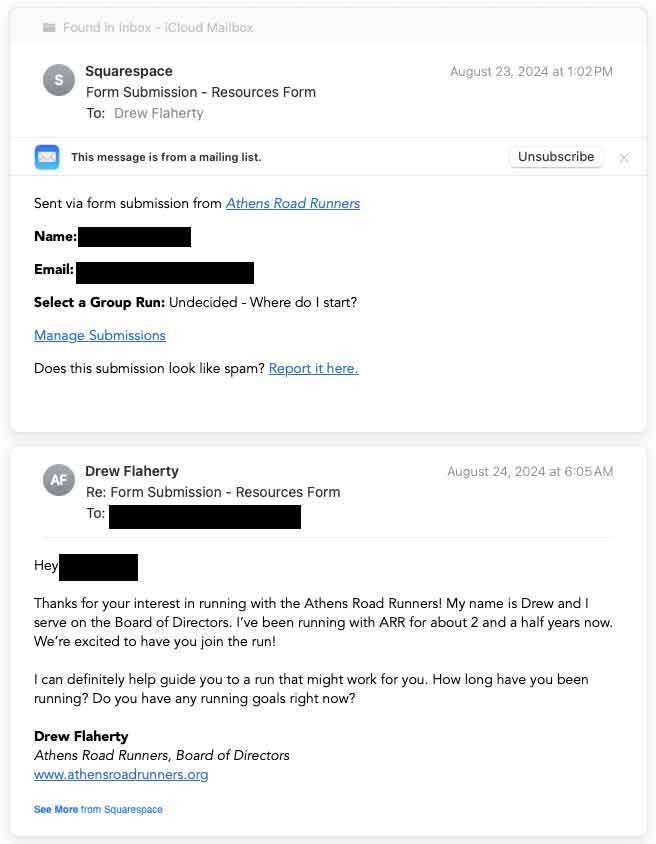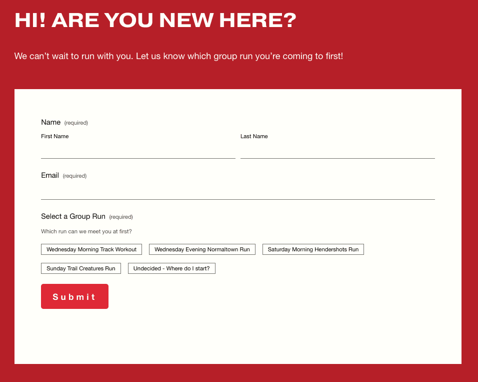 I created a “New Athlete” page and made the primary action an introductory form that allows users to indicate what run they will attend. It motivates them to commit to a run and we can ensure a current member knows to look out for them.