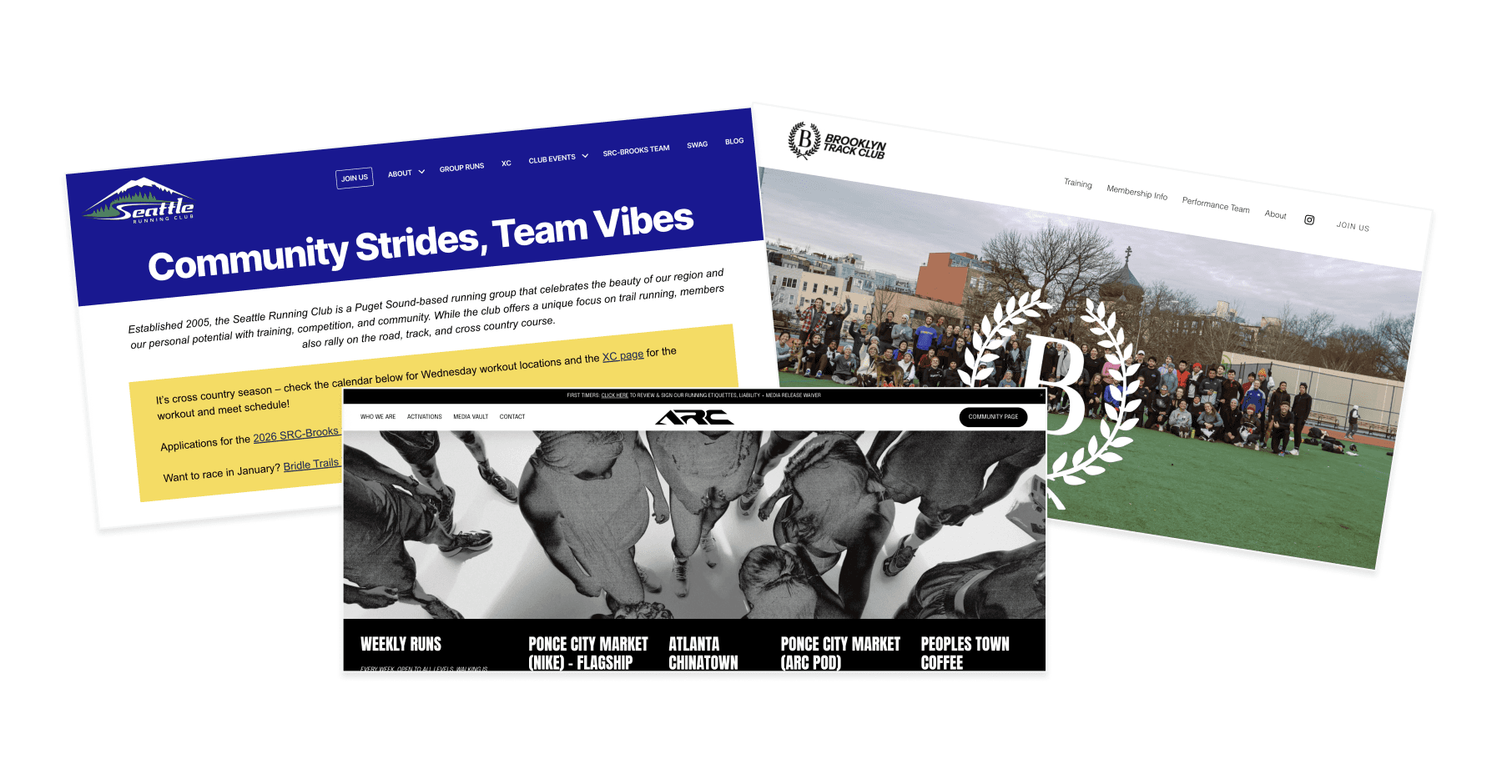 My first step in the redesign process was to research aspirational track clubs. I chose various geographic areas with a broad range of populations to understand how community-running groups serve their specific locations. From the research, several themes made a website stand out: