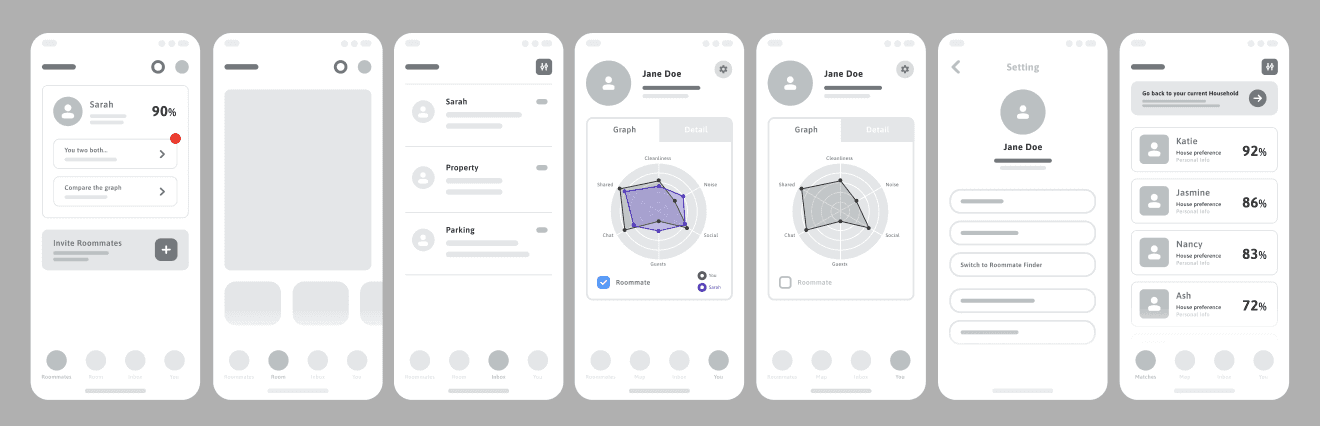 The think-aloud protocol asked users to work through seven tasks across three distinct functions of the app: 1) registering and finding a roommate, 2) keeping up with their roommate in the app, and 3) finding another roommate after the end of a lease.This journey allowed us to uncover major areas of use (or confusion) in the information architecture.